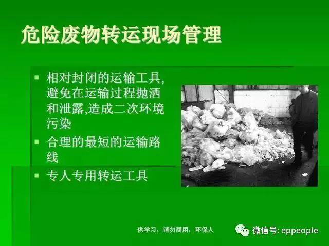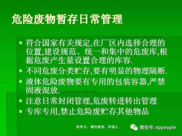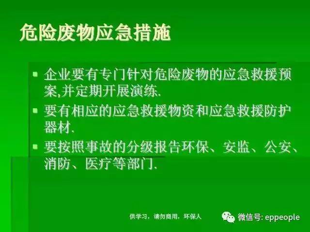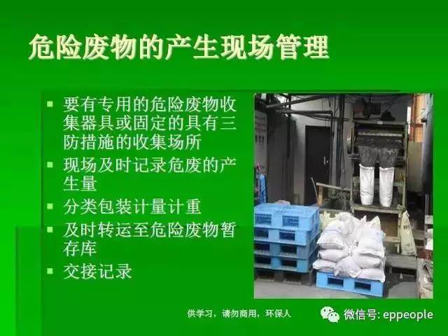 2)危廢收集:危險廢物需要用專門容器,根據(jù)成分進行分類收集。危險廢物分類收集必須與綜合利用和處理處置相結(jié)合。裝運危險廢物的容器應根據(jù)各種危險廢物的不同特性而設計,能有效地防止?jié)B漏、擴散。裝有危險廢物的容器必須貼有標簽,在標簽上詳細標明危險廢物的名稱、重量、成分和特性